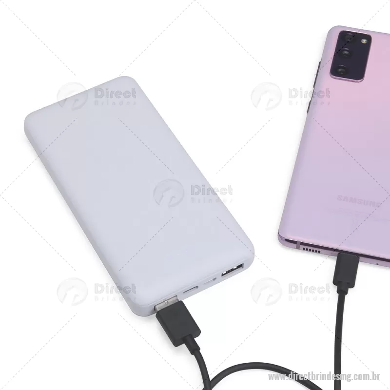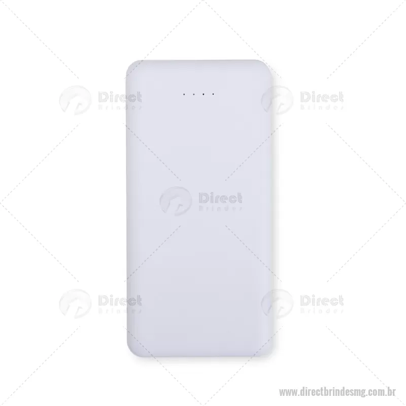 Power Bank 10.000mAh com Indicador LED Descrição: Power bank com estrutura em plástico com potência de 10.000mAh e quatro luzes de LED para indicar o status de carga do próprio carregador portátil. Possui quatro entradas diferentes: duas portas USB, uma porta Micro USB e outra USB-C. Altura : 14 cm x Espessura : 1,5 cm x Comprimento : 7 cm Peso aproximado (g): 243 - - DRTMGTEC531