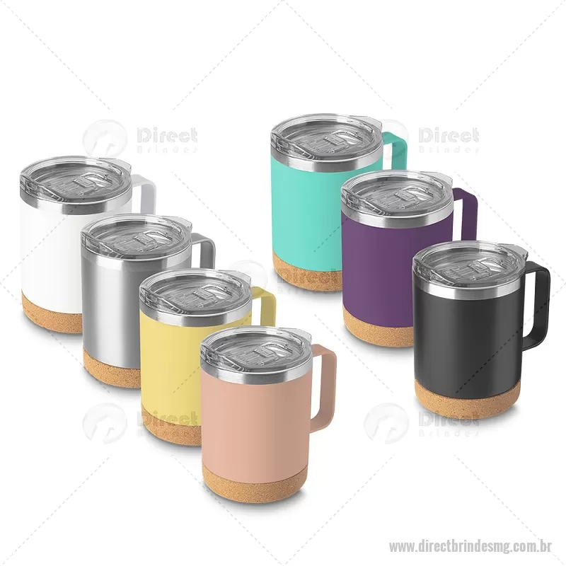 Caneca térmica em aço inox com parede dupla isolada à vácuo, tampa plástica e anel em silicone para vedação, alça lateral em inox na cor do produto, base em cortiça. Capacidade 350ml. - - DRTMGCAN076