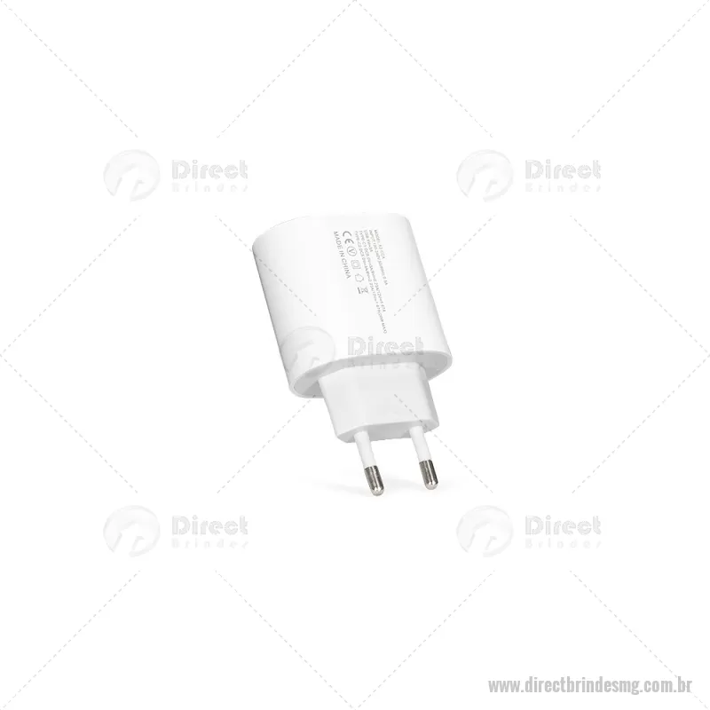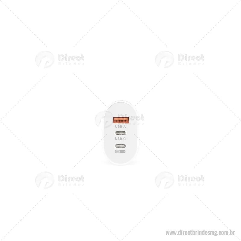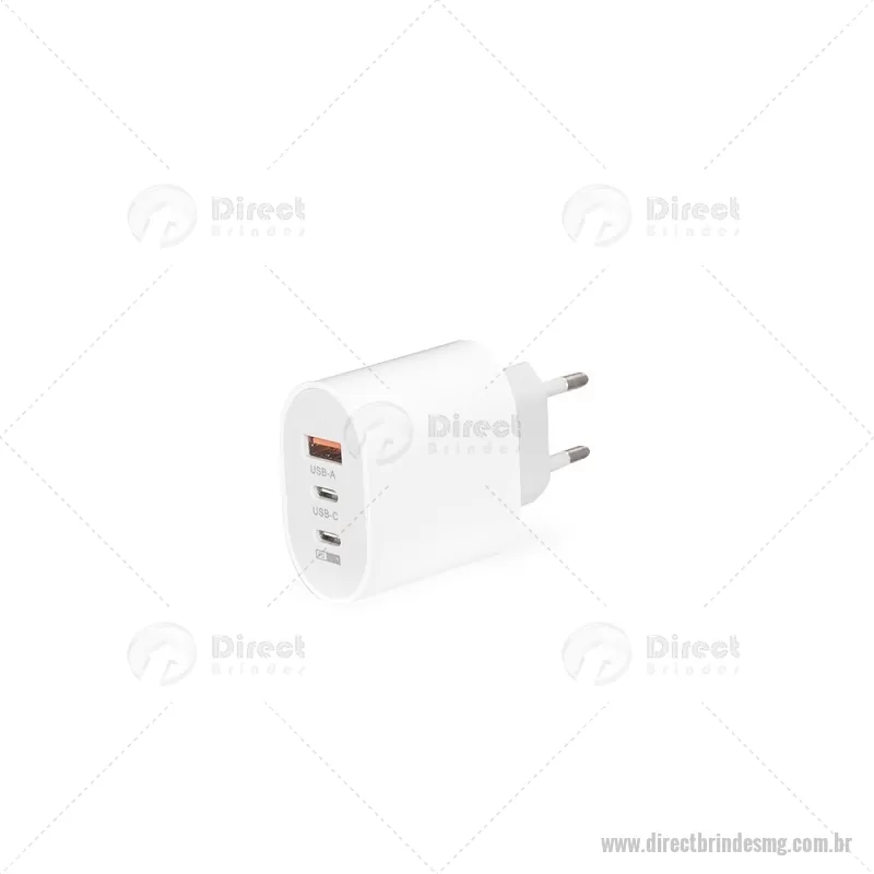 Carregador rápido em plástico leve e compacto, com três portas: uma USB-A e duas USB-C, incluindo uma opção de carregamento rápido de 20W. Ideal para recarregar diferentes dispositivos com praticidade. Cabo USB não incluído. - - DRTMGTEC535