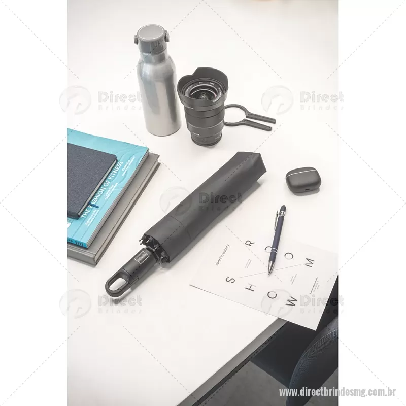 GUSTAVO. Guarda-chuva dobrável de 23'' em 100% poliéster reciclado pongee 190T (100% rPET) com abertura e fecho automático Guarda-chuva de 23'' em poliéster 100% reciclado pongee 190T, com varetas em fibra de vidro, haste metálica e pega em ABS 35% reciclado. O guarda-chuva, dobrável em 3 seções, tem abertura e fecho automático e é à prova de vento. Fornecido em bolsa. Medidas: ø1050 x 330 mm | Sacola: ø50 x 250 mm Peso do Produto (g.): 380 - - DRTMGGCH052