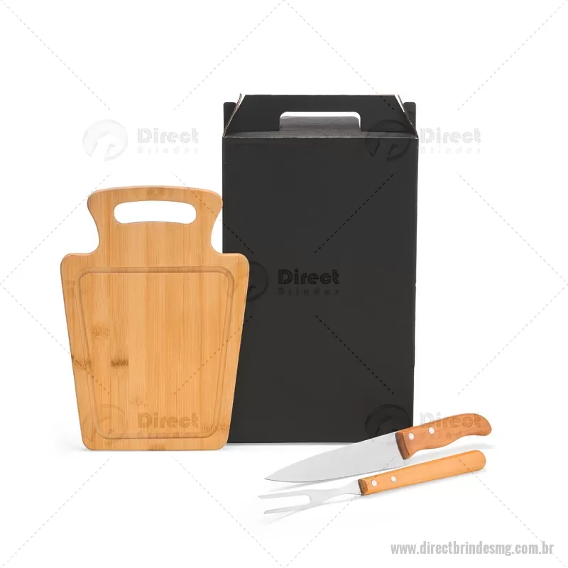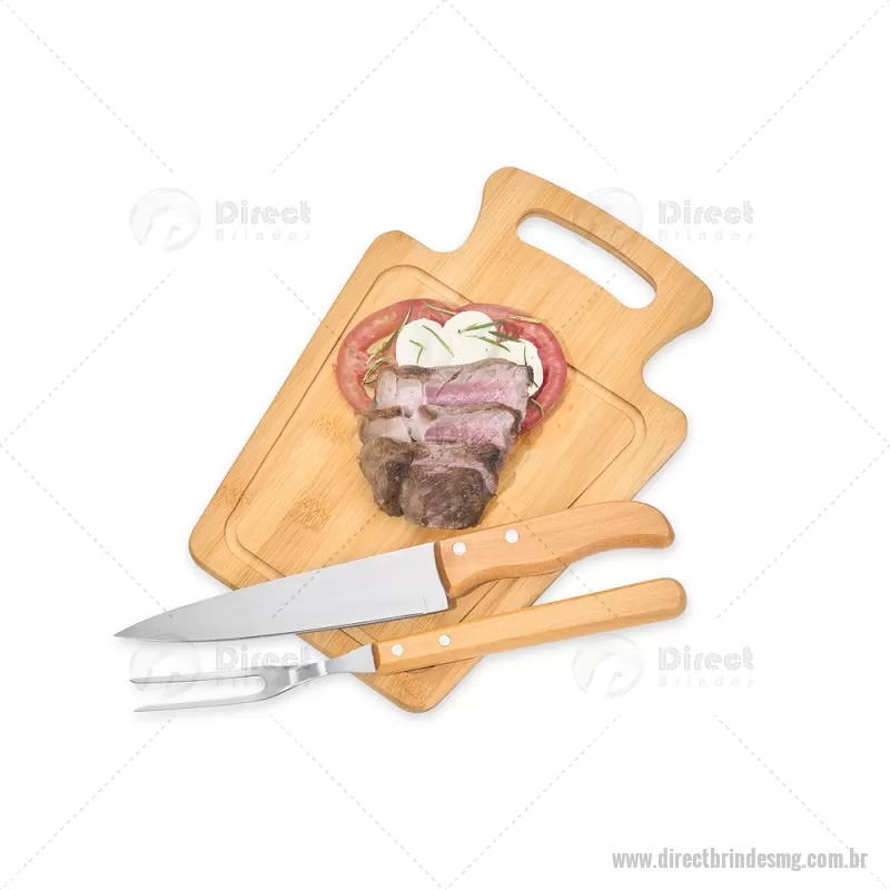 Conjunto Para Churrasco Em Bambu / Madeira / Inox - 3 Pçs Composto por tábua em Bambu com 30x21x1,2 cm; faca 7'' e garfo em Madeira/Inox. Dimensões do Produto Tábua: 30x21x1,3 cm Sugestão de Personalização Uma gravação a Laser na petisqueira e lâmina da faca; uma gravação em Silk/Digital na caixa. Embalagem : Caixa Preta 40x21,8x4,5 cm (AxLxP) Peso: 619 g (com embalagem) - - DRTMGKCH095