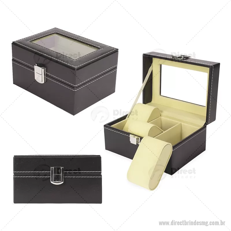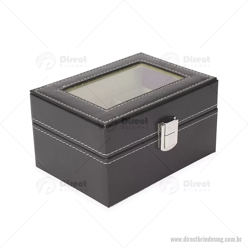 Estojo porta relógios com acabamento externo em couro sintético à base de PVC e interior revestido em veludo macio. Possui duas divisórias com almofadas removíveis para acomodar os relógios, tampa com visor de vidro e fecho com trava de segurança, garantindo proteção e organização com elegância. - - DRTMGPREL002
