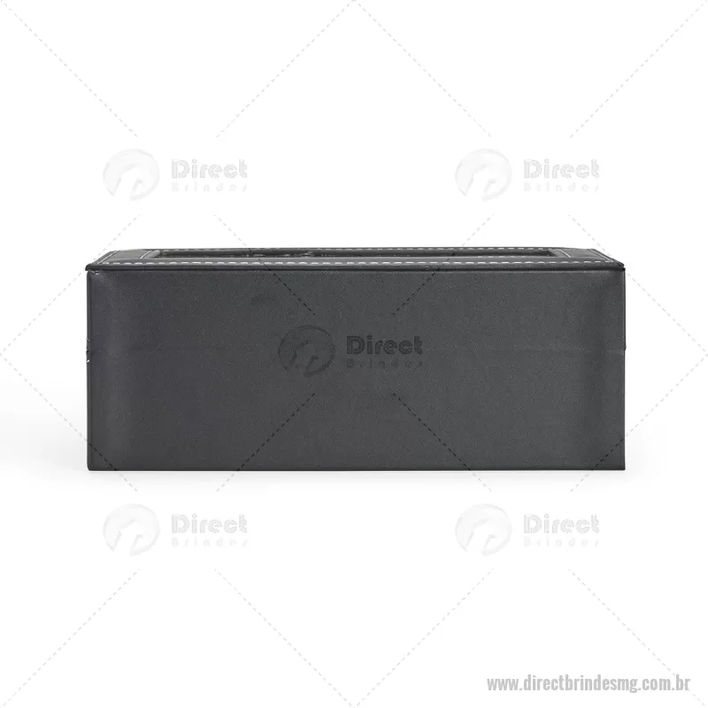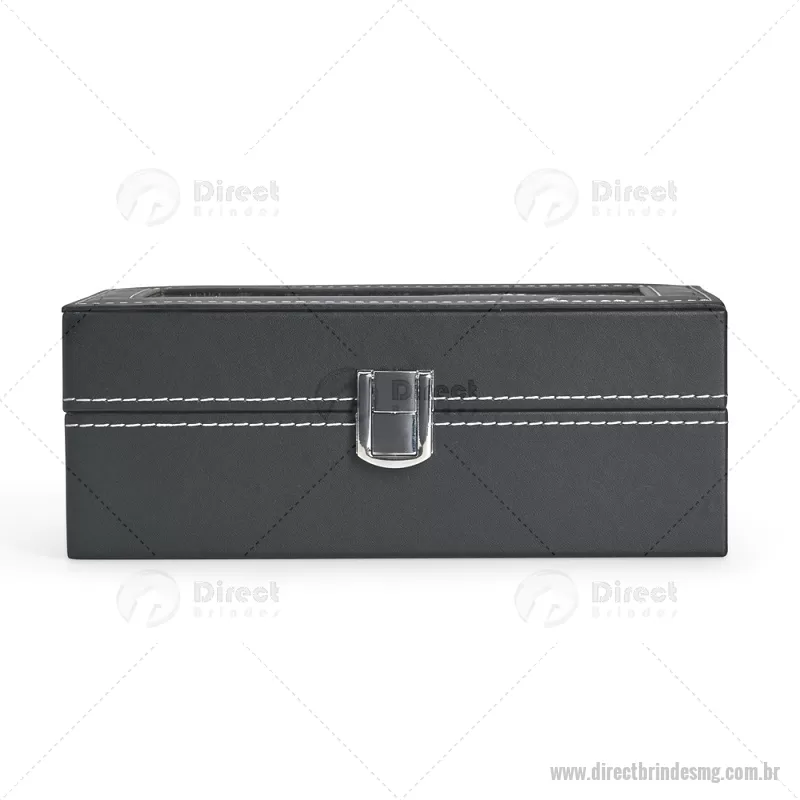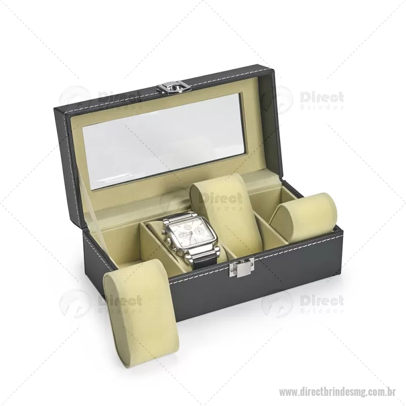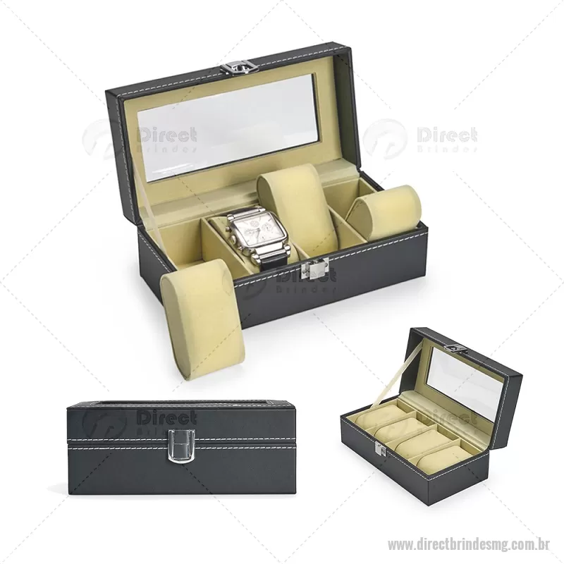 Porta-relógios com acabamento em couro sintético em PVC e interior forrado em veludo. Possui quatro compartimentos com almofadas de espuma removíveis, visor superior em vidro e trava de segurança, ideal para organizar e proteger relógios com elegância. - - DRTMGPREL003