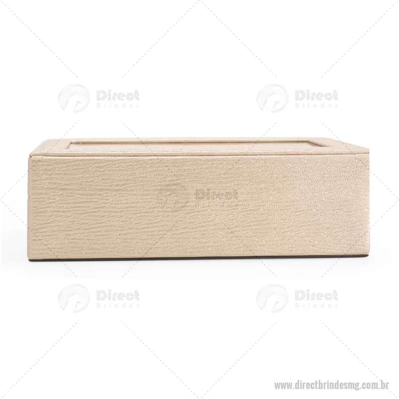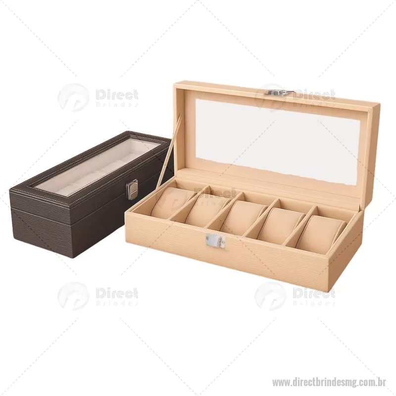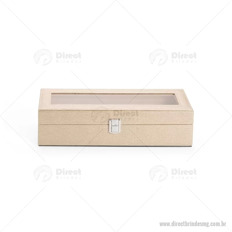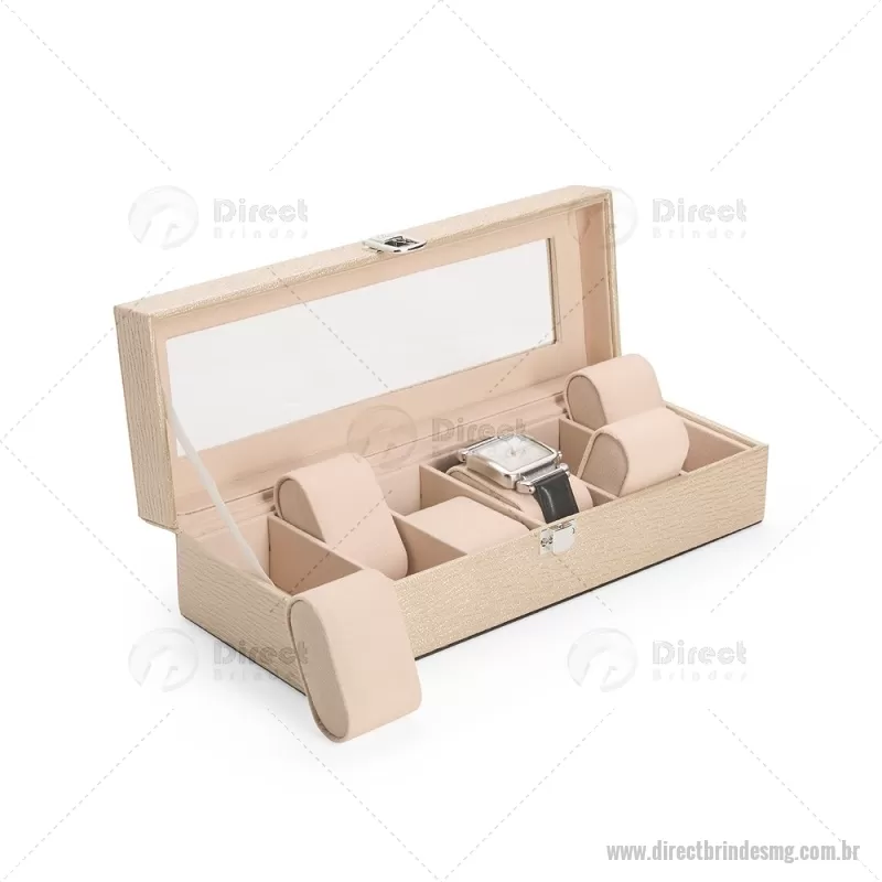 Porta-relógios com acabamento em couro sintético texturizado à base de PVC e interior revestido em tecido aveludado. Possui seis compartimentos com almofadas removíveis, visor em vidro transparente e trava de segurança, ideal para organizar e proteger relógios com elegância. - - DRTMGPREL004