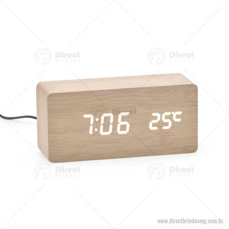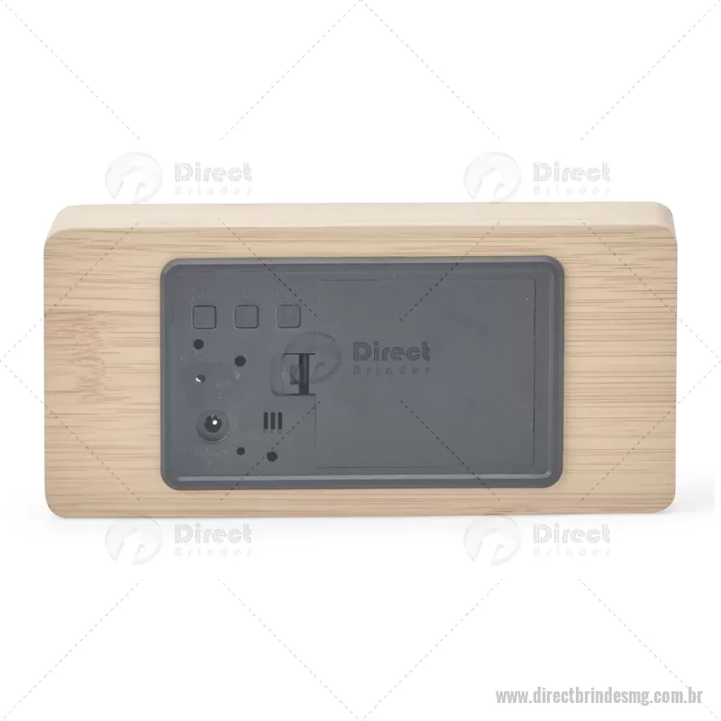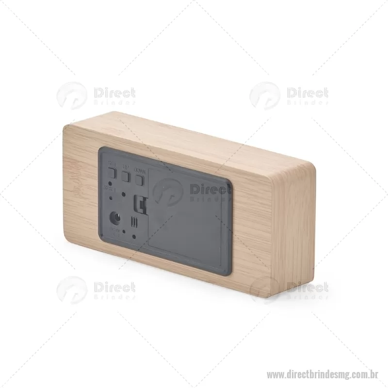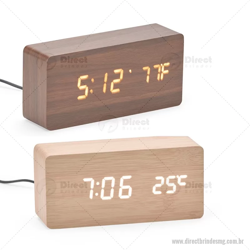 Relógio despertador em madeira com display LED, que combina design elegante e tecnologia moderna. Exibe horas, data e temperatura ambiente, além de permitir a programação de até três alarmes com diferentes configurações. Pode ser alimentado por 4 pilhas AAA (não inclusas) ou por cabo USB DC 5V, que acompanha o produto, oferecendo praticidade para o uso diário. - - DRTMGREL023