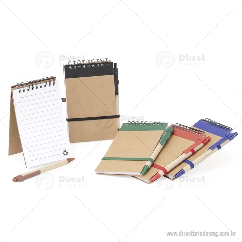 Bloco de anotações ecológico com caneta, feito em kraft com detalhe plástico. Contém aproximadamente 70 folhas brancas com pauta, porta caneta elástico, elástico para lacre e acompanha caneta de papelão com detalhes plásticos, carga esferográfica azul 1.0mm e acionamento por clique. Largura : 9 cm x Espessura : 1,5 cm x Comprimento : 14,9 cm Tamanho total aproximado (CxL): Caneta - 13,8 cm x 1,4 cm Peso aproximado (g): 74 - - DRTMGBLC216