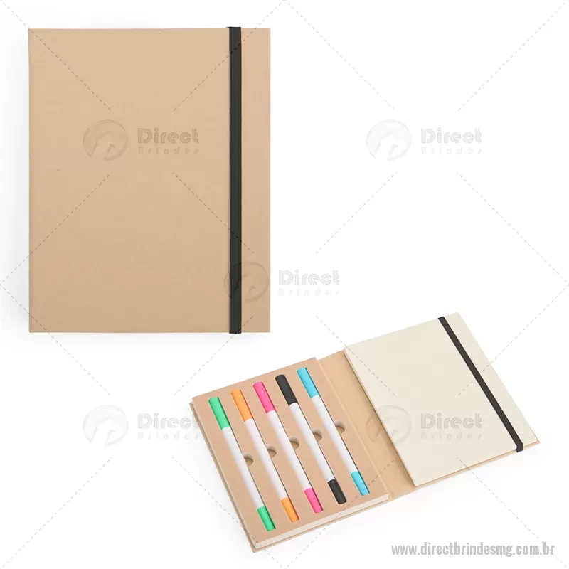 Bloco de anotações com capa dura em kraft e fechamento por elástico. Possui aproximadamente 80 folhas de tonalidade marfim sem pautas e cinco canetas coloridas de ponta dupla: uma fina e outra tipo pincel. Largura : 14,3 cm x Espessura : 2,3 cm x Comprimento : 18,1 cm Tamanho total aproximado (CxL): Caneta: 16,1 cm x 1 cm Peso aproximado (g): 247 - - DRTMGBLC280