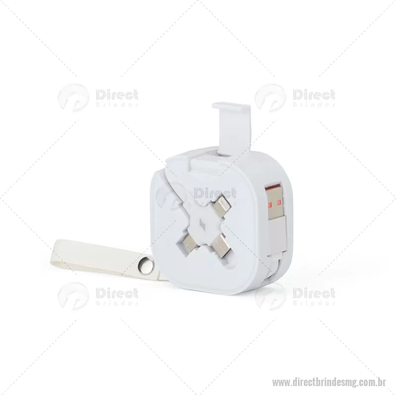 Cabo USB retrátil com suporte para celular. Contém entradas Lightning/iPhone, V8/Android, Tipo-C/Android e 4 diferentes ajustes do comprimento dos cabos. Suporte de frente lisa e com alça para transporte em couro sintético. - - DRTMGTEC509