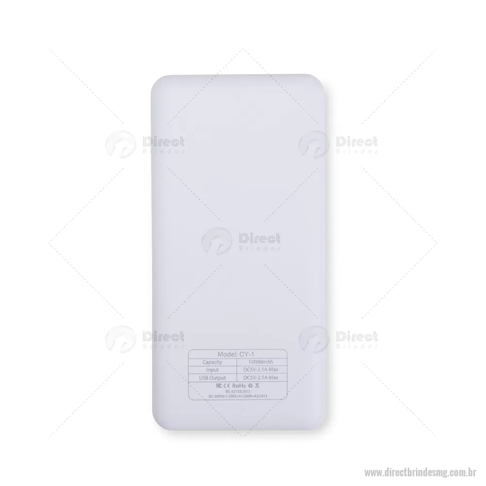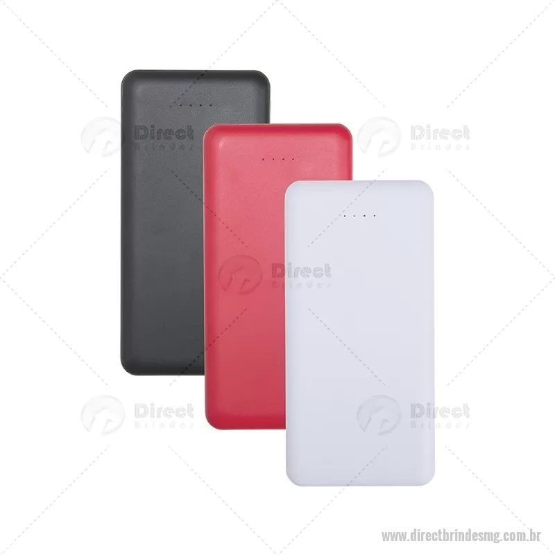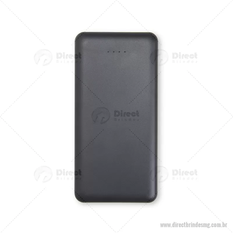 Power Bank 10.000mAh com Indicador LED Descrição: Power bank com estrutura em plástico com potência de 10.000mAh e quatro luzes de LED para indicar o status de carga do próprio carregador portátil. Possui quatro entradas diferentes: duas portas USB, uma porta Micro USB e outra USB-C. Altura : 14 cm x Espessura : 1,5 cm x Comprimento : 7 cm Peso aproximado (g): 243 - - DRTMGTEC531