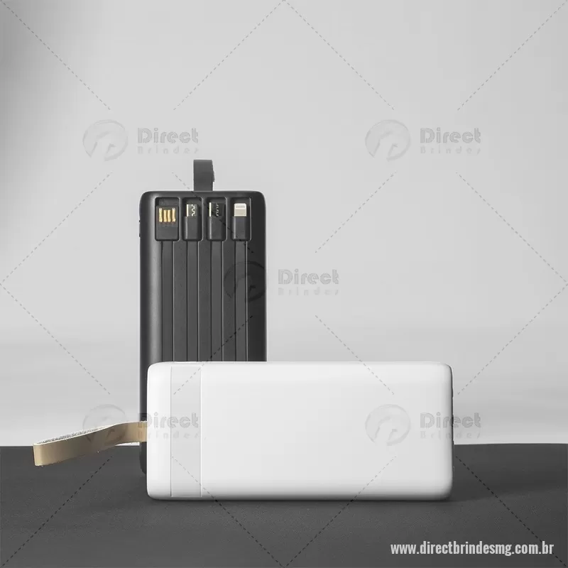 Power Bank 20.000mAh com Lanterna e Multissaídas Descrição: Power bank em plástico com capacidade de até 20.000mAh. Possui quatro cabos integrados com saídas Lightning, USB-C, Micro-USB e USB. Conta ainda com duas entradas, uma USB-A e outra USB-C, painel de LED numérico e lanterna frontal e alça fixa em couro sintético para transporte. Acompanha cabo USB-C. Altura : 15 cm x Largura : 6,8 cm x Espessura : 3 cm Peso aproximado (g): 418 - - DRTMGTEC532