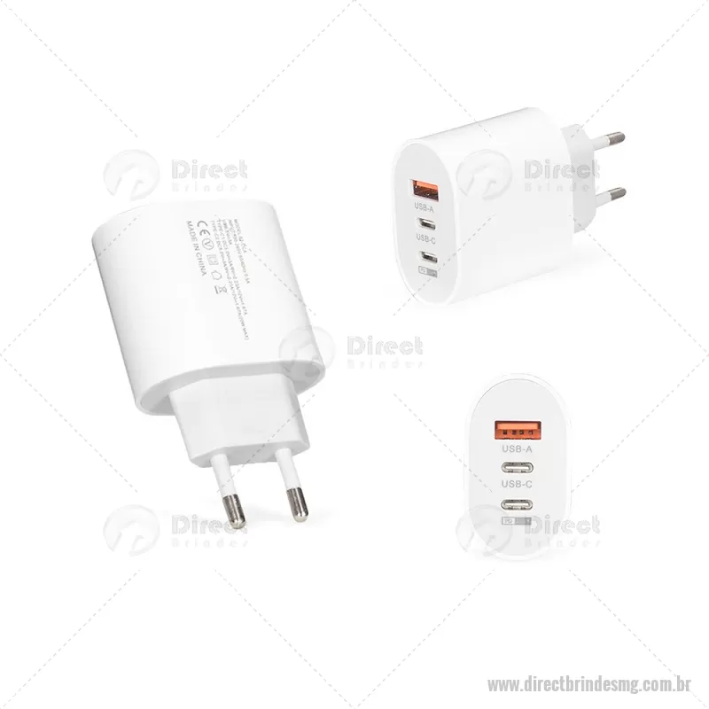 Carregador rápido em plástico leve e compacto, com três portas: uma USB-A e duas USB-C, incluindo uma opção de carregamento rápido de 20W. Ideal para recarregar diferentes dispositivos com praticidade. Cabo USB não incluído. - - DRTMGTEC535