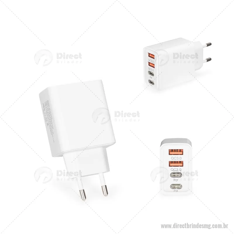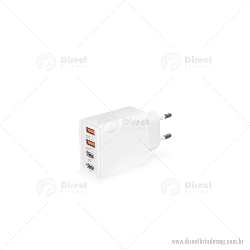 Carregador rápido em plástico leve e compacto, equipado com quatro portas: uma USB padrão, uma USB com tecnologia QC 3.0 para carregamento acelerado e duas entradas USB-C. Prático para uso diário e compatível com diversos dispositivos. Não acompanha cabo. - - DRTMGTEC534