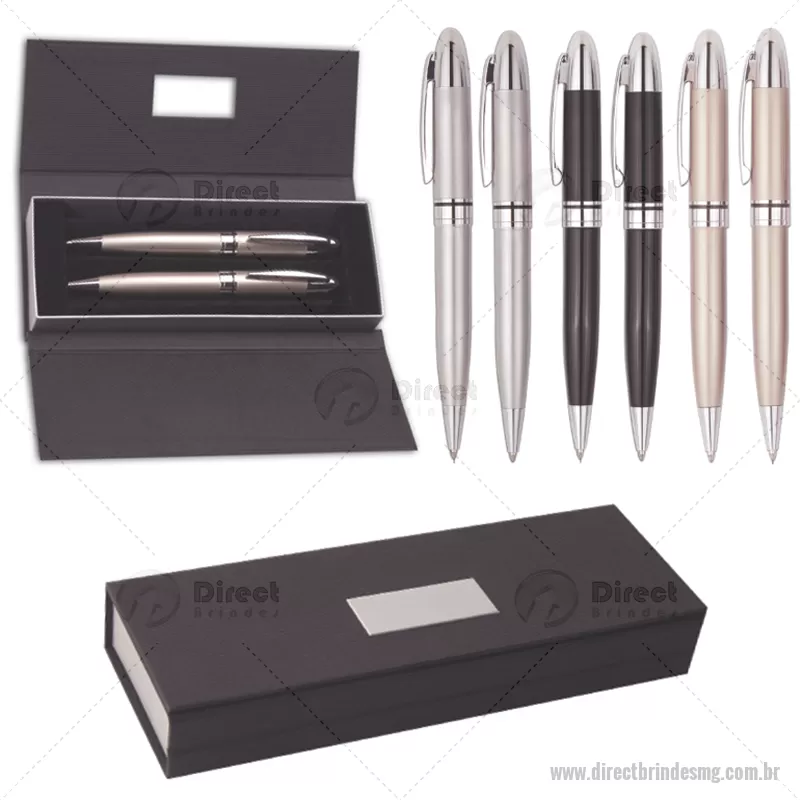 Conjunto caneta e lapiseira metal ER180PAR, cromada nas cores prata, preta ou champanhe com detalhe prata. Embalagem caixinha preta. Gravação à laser. - - DRTMGCOJ056