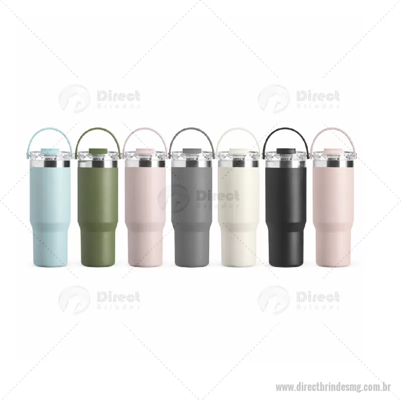 Copo térmico em aço inox com capacidade de 900ml, construído com parede dupla e isolamento a vácuo para melhor conservação térmica. Possui tampa plástica rosqueável com vedação, tampa protetora de bocal, bico flip e canudo interno removível. Inclui alça para transporte e acabamento em pintura eletrostática de alta resistência. - - DRTMGCPO154