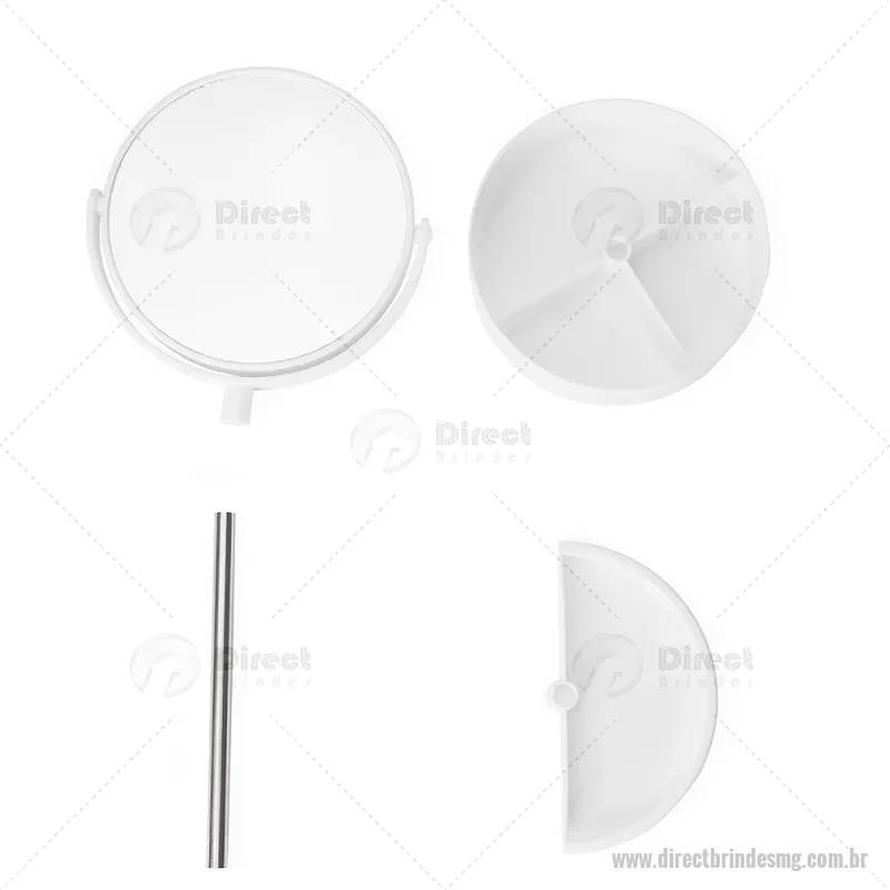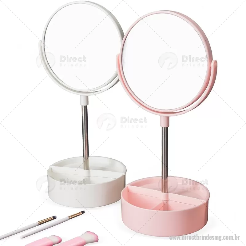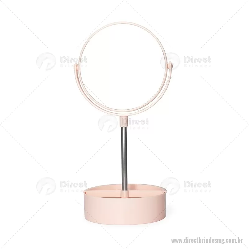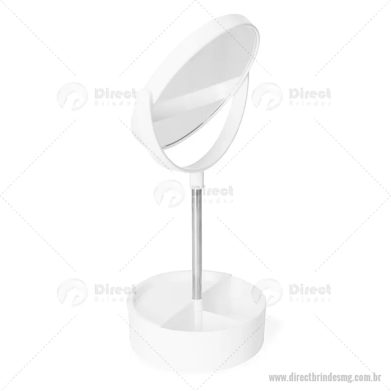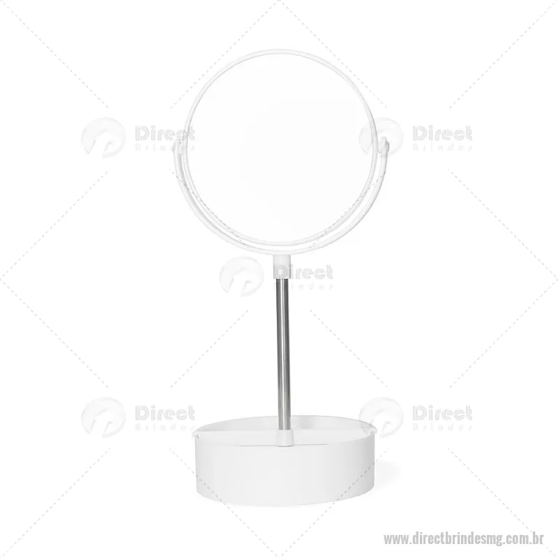 Espelho de Mesa Plástico Descrição: Espelho de mesa dupla face giratório com base e moldura feitas em plástico e pedestal de alumínio. Contém três divisórias na base para organizar de objetos diversos. Altura : 34,5 cm x Largura : 14,5 cm Peso aproximado (g): 275 - - DRTMGFEM121