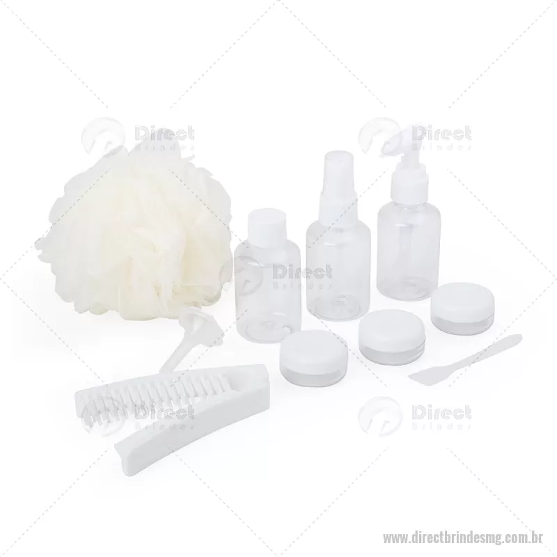 Kit Viagem 10 Peças Descrição: Este kit viagem oferece organização e praticidade em 10 peças essenciais para armazenar e aplicar produtos de higiene e beleza. Com frascos produzidos em PET, o kit contém 1 frasco spray de 60ml, 1 frasco com tampa rosqueável de 60ml, 1 frasco pump de 60ml com trava, 3 potinhos de 8ml, espátula, funil, escova de cabelo e pente 2 em 1 e uma esponja de nylon com alça, ideal para uso com sabonete líquido, deixando a pele mais suave e macia. Todas as peças vêm acomodadas em um estojo de PVC com alça, garantindo fácil transporte e um cuidado ideal para viagens ou eventos longe de casa. Altura : 10 cm x Largura : 18,5 cm x Profundidade : 6 cm Peso aproximado (g): 147 - - DRTMGKVG014