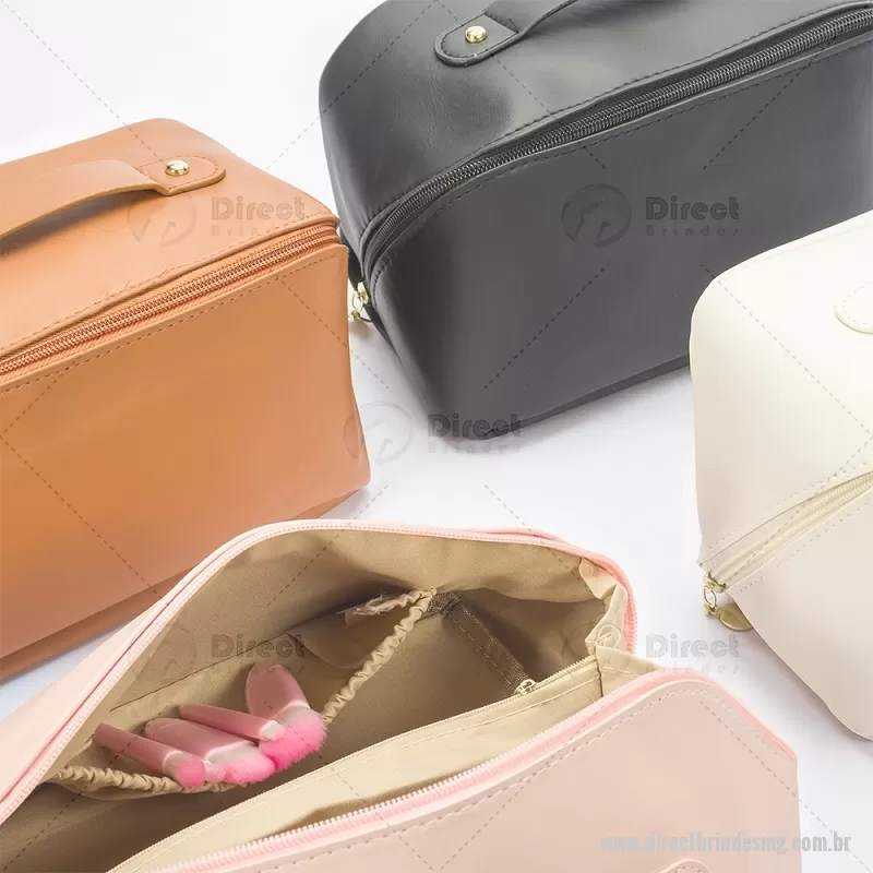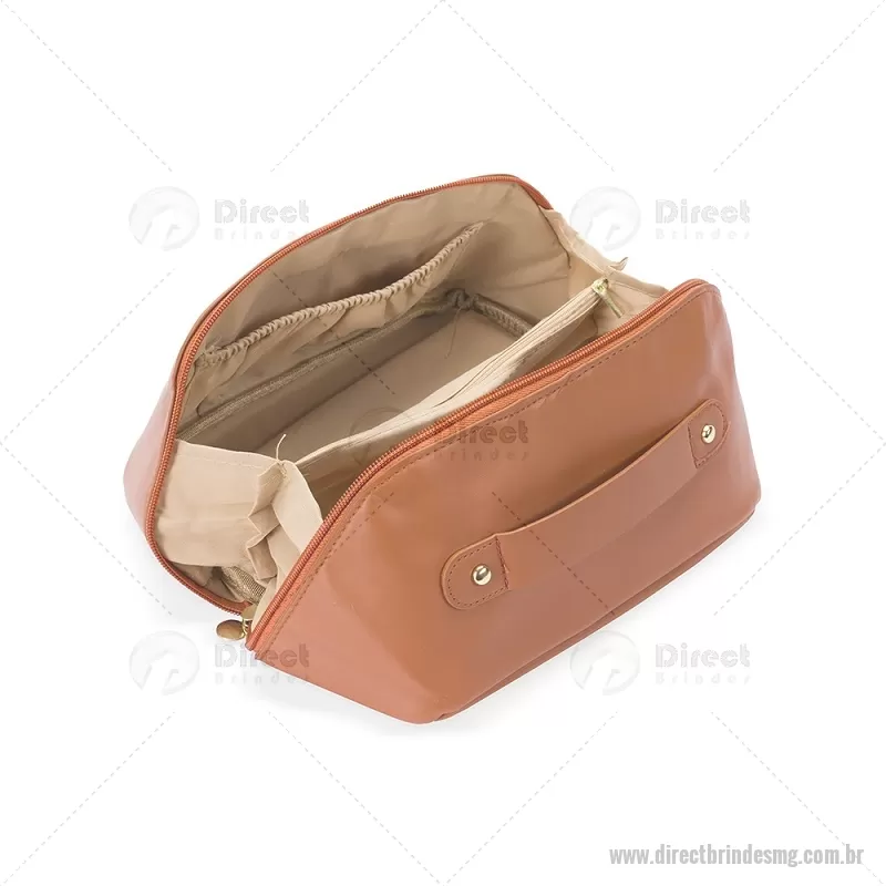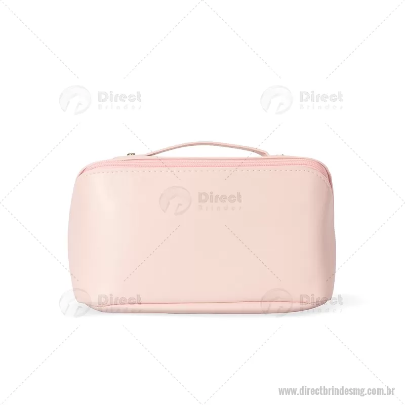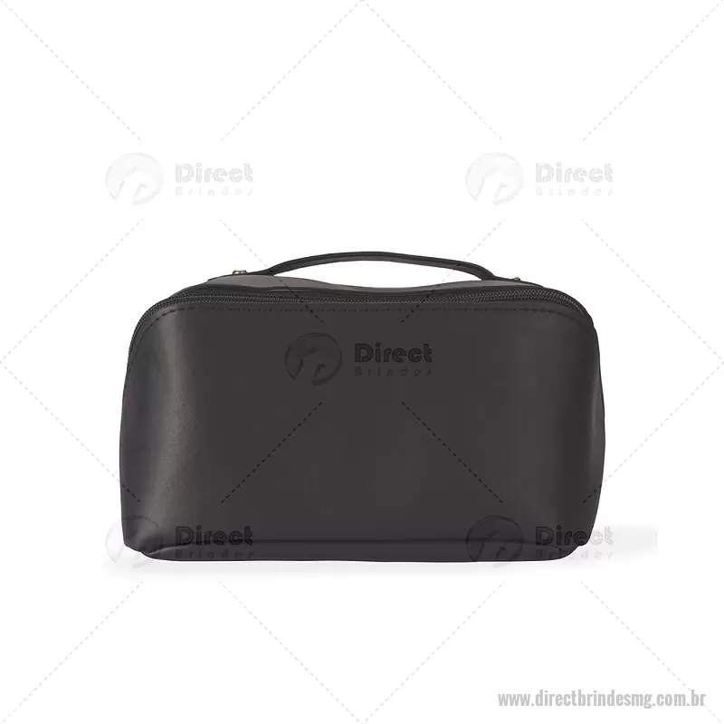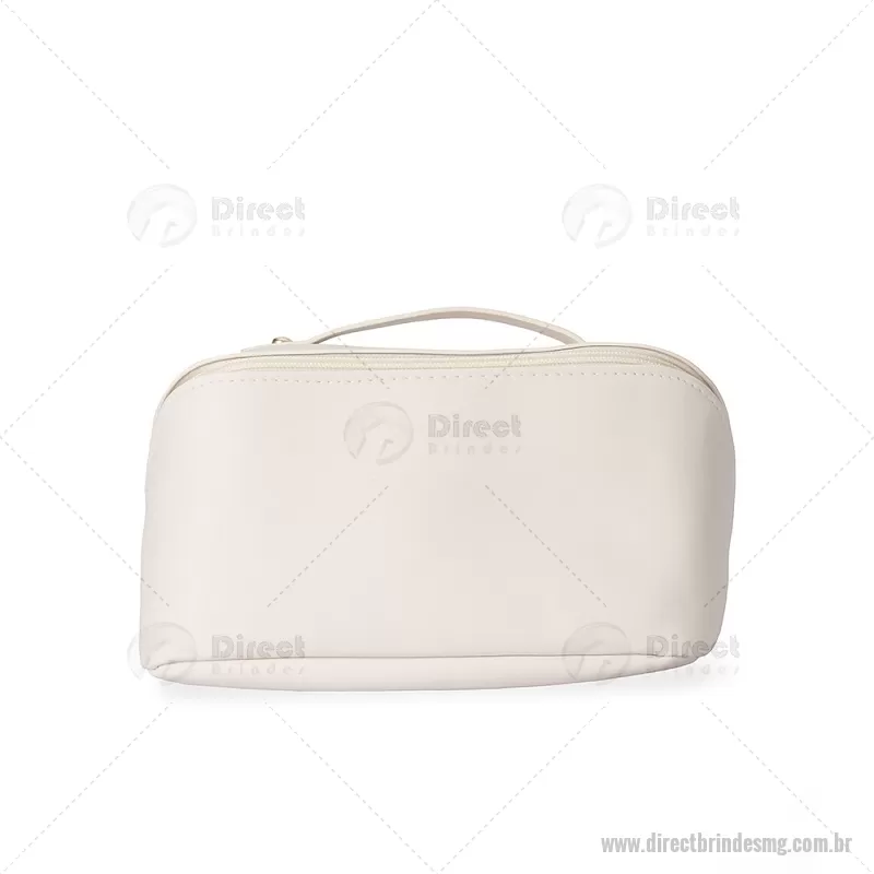 Nécessaire em PU impermeável com abertura em 180 graus, estilo concha, oferecendo fácil visualização dos itens. Possui compartimento interno amplo com dois bolsos laterais e um bolso central com zíper, além de alça para transporte. Ideal para organizar acessórios e produtos pessoais. - - DRTMGNC146
