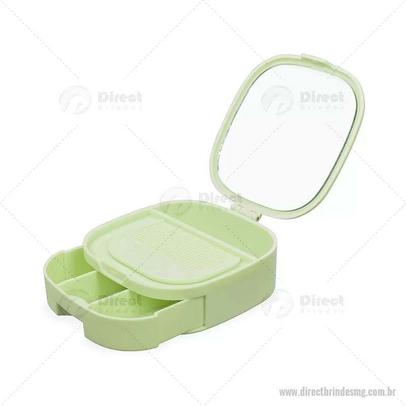 Porta-joias feito em plástico com espelho sem aumento na parte interna da tampa. Possui compartimentos internos de tamanhos variados e uma gaveta com três divisórias. Acompanha um pente compacto para cabelos. Altura : 3,5 cm x Largura : 9,9 cm x Comprimento : 9,9 cm Peso aproximado (g): 133 - - DRTMGFEM120