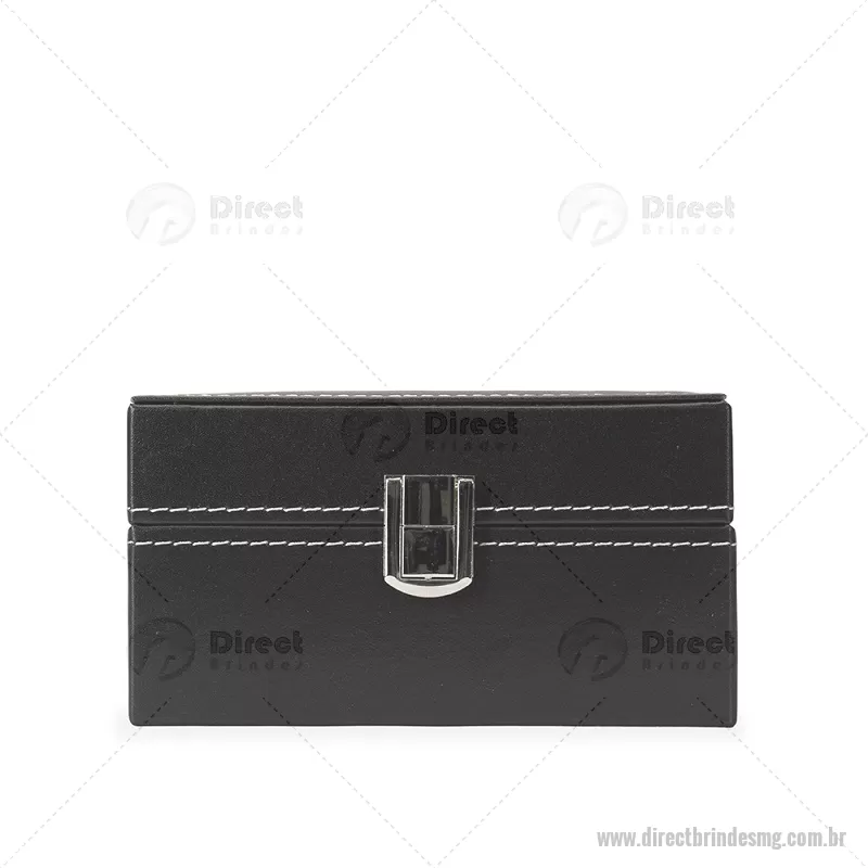 Estojo porta relógios com acabamento externo em couro sintético à base de PVC e interior revestido em veludo macio. Possui duas divisórias com almofadas removíveis para acomodar os relógios, tampa com visor de vidro e fecho com trava de segurança, garantindo proteção e organização com elegância. - - DRTMGPREL002