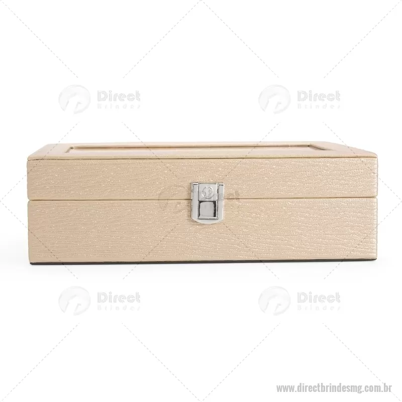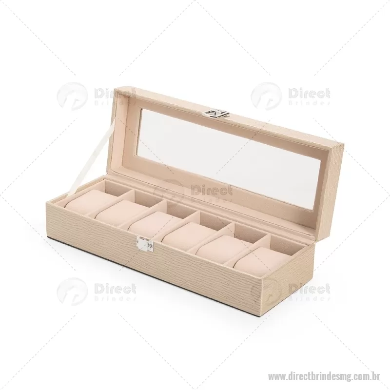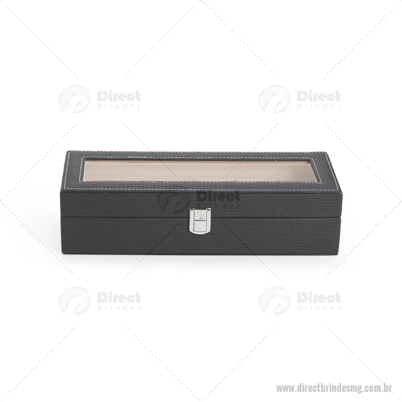 Porta-relógios com acabamento em couro sintético texturizado à base de PVC e interior revestido em tecido aveludado. Possui seis compartimentos com almofadas removíveis, visor em vidro transparente e trava de segurança, ideal para organizar e proteger relógios com elegância. - - DRTMGPREL004