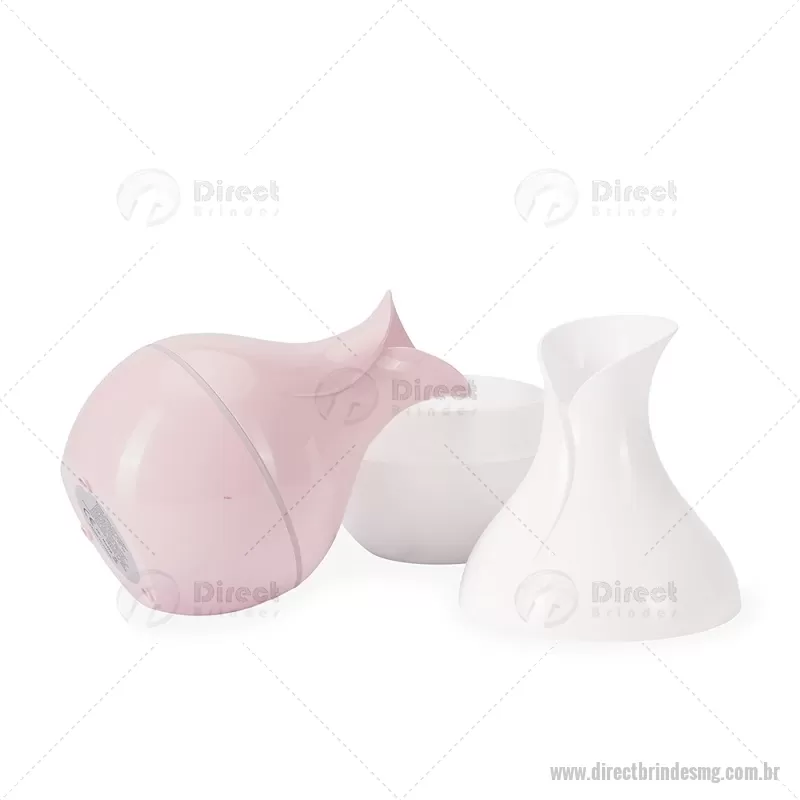 Umidificador de ar em plástico com design tipo vaso, iluminação LED e reservatório de 200 ml. Oferece modos de névoa contínua ou intermitente e funciona conectado a uma fonte de energia via entrada USB-C. Acompanha filtro de algodão e cabo USB-C. - - DRTMGTEC537
